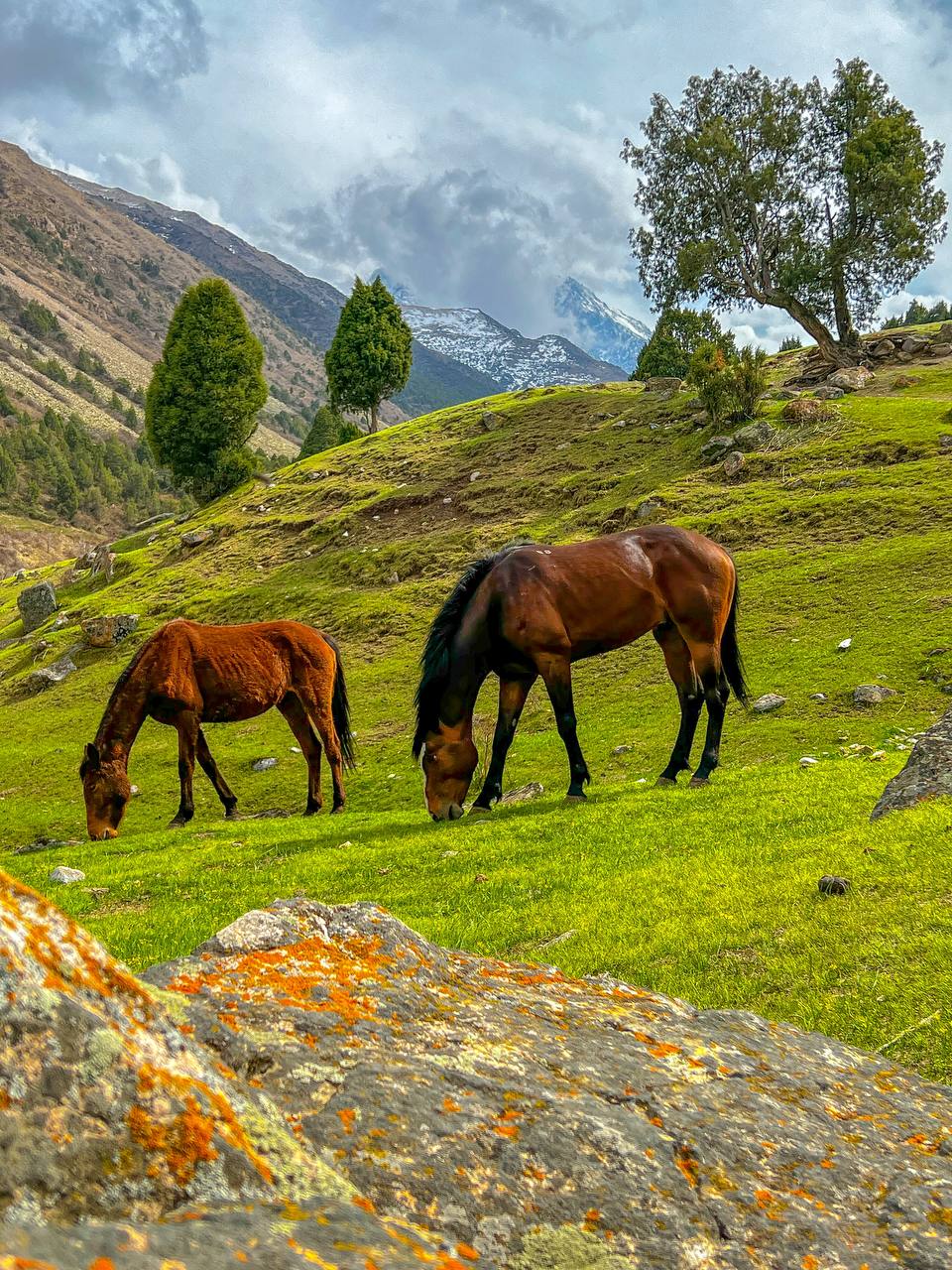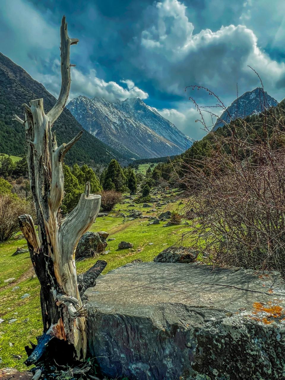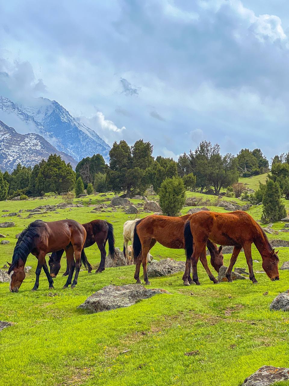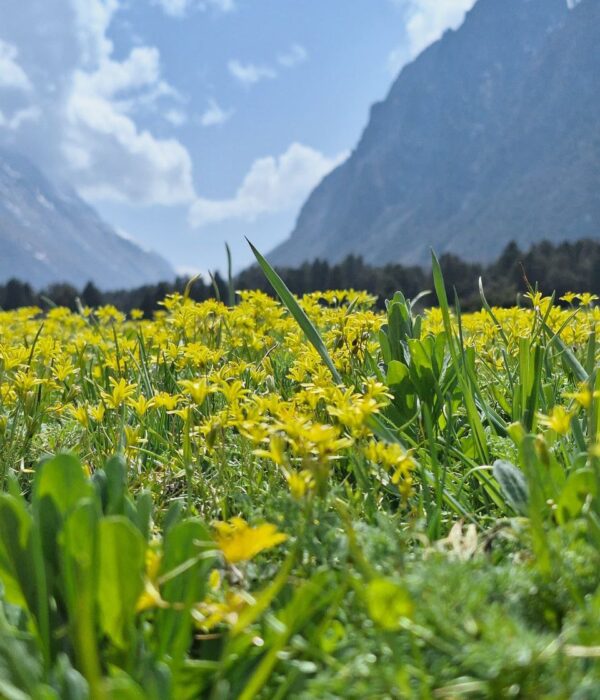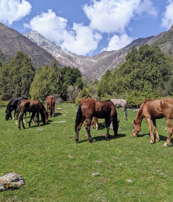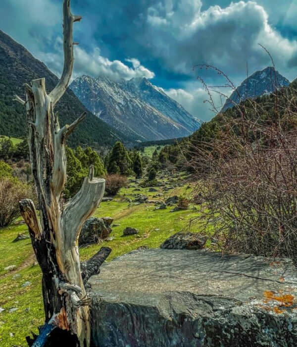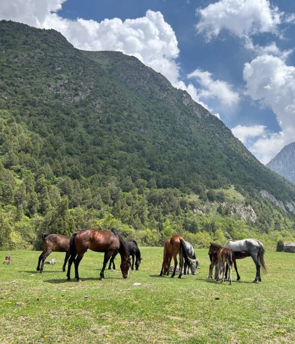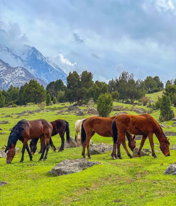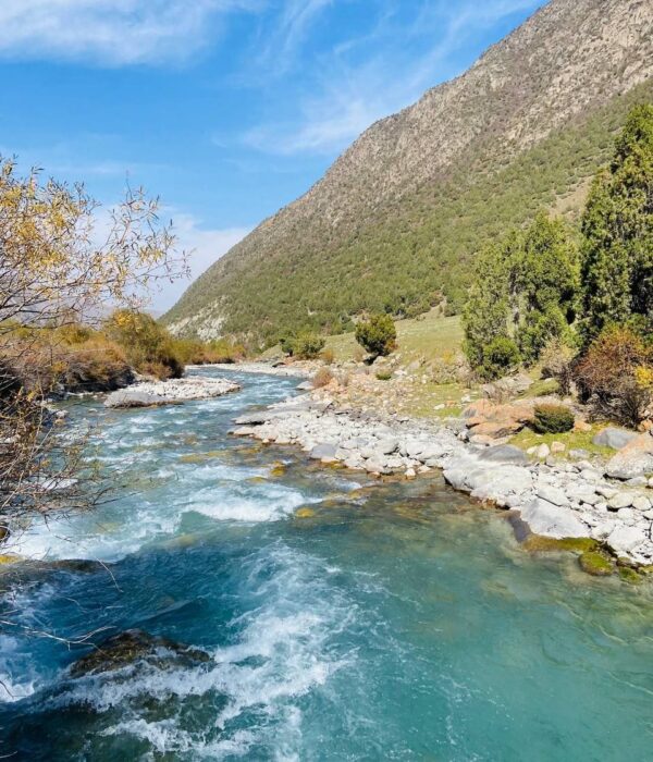 Живописная тропа: Вас ждет прогулка по живописным березовым рощам и зарослям арчи, которые создают неповторимый контраст с мощными панорамами снежных вершин.