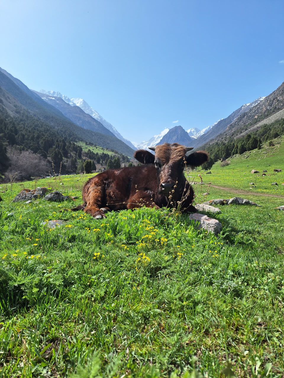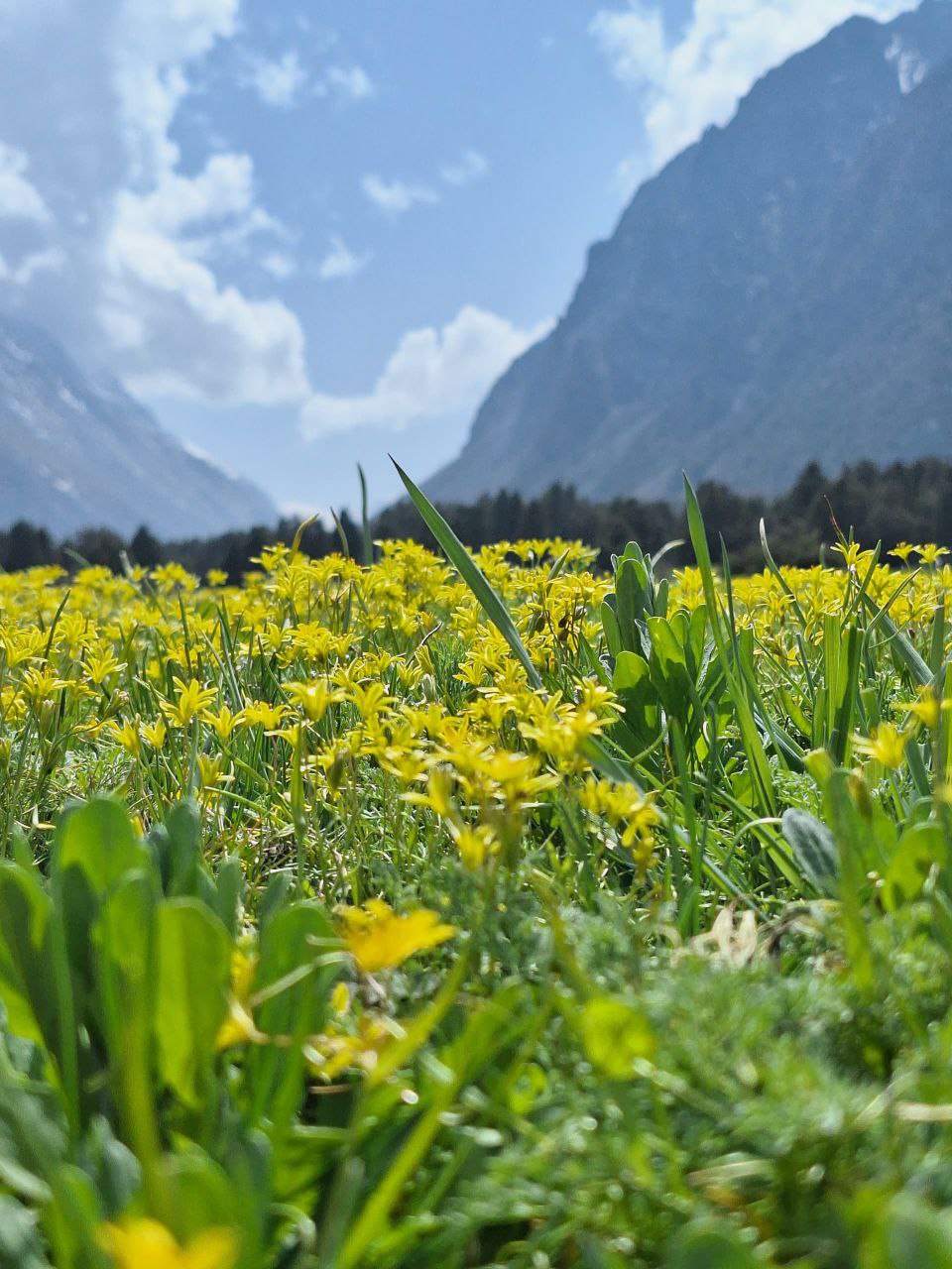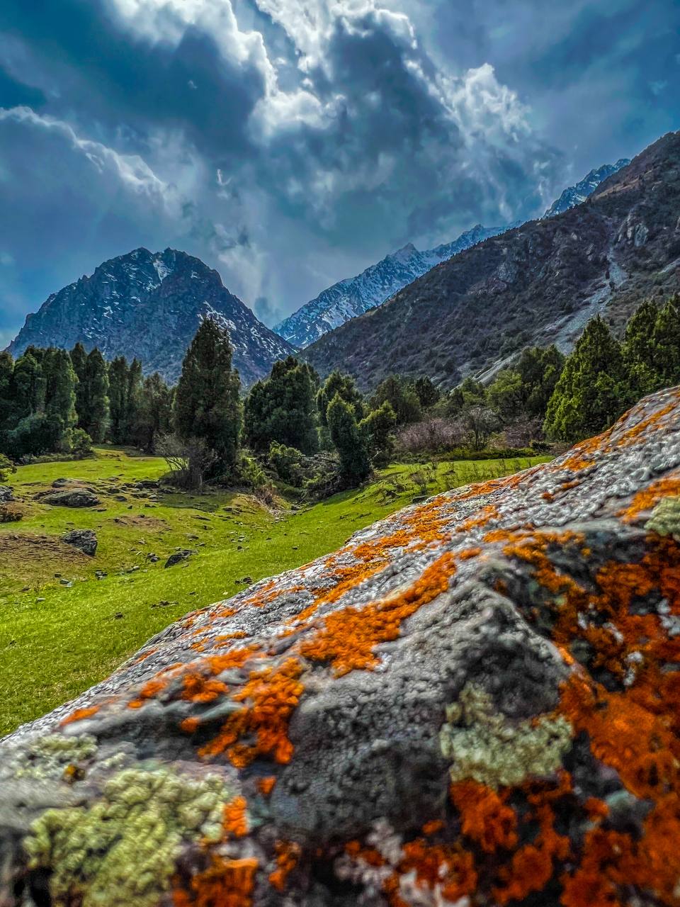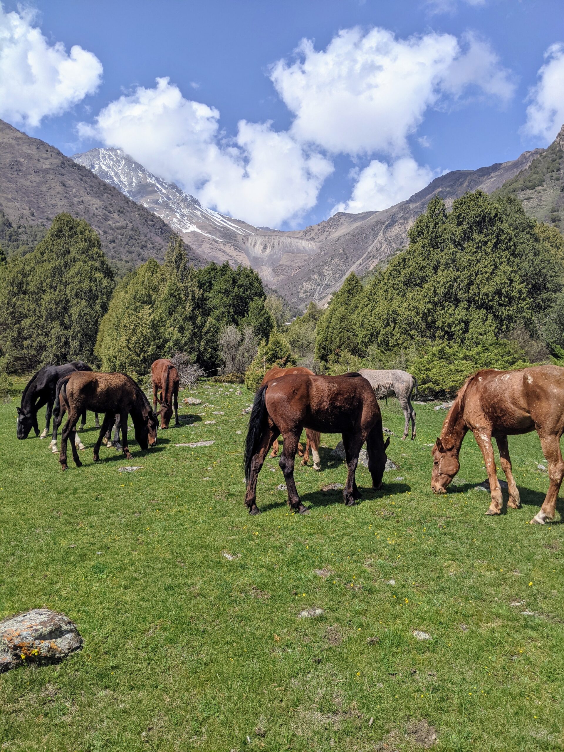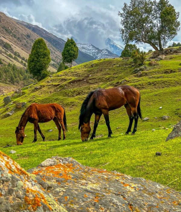 Живописная тропа: Вас ждет прогулка по живописным березовым рощам и зарослям арчи, которые создают неповторимый контраст с мощными панорамами снежных вершин.